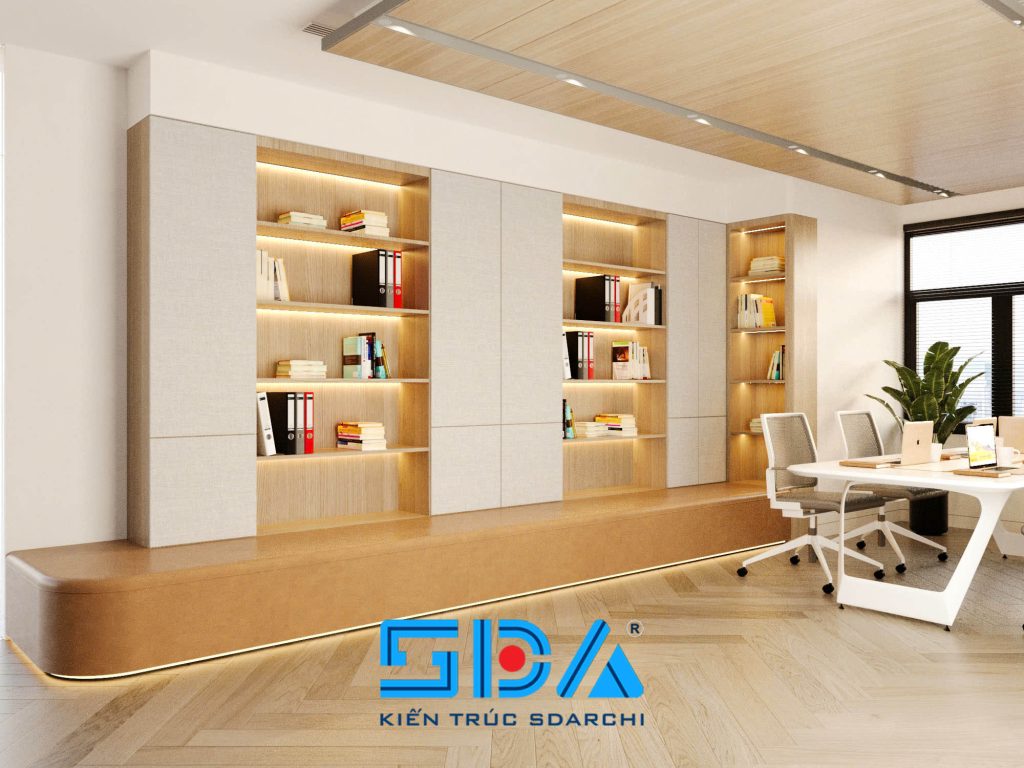 Hệ tủ tài liệu (Pantry/Storage) thiết kế âm tường kết hợp đèn LED cảm biến. Phần bục thấp (bench) vừa là nơi lưu trữ, vừa là chỗ ngồi thư giãn ngắn cho nhân viên.